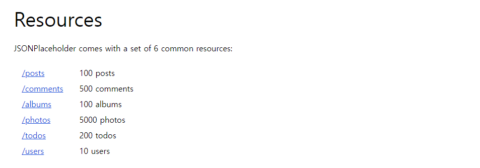 아래와 같이 JSONPlacehoder 주소에 리소스 접미어를 붙여준다.