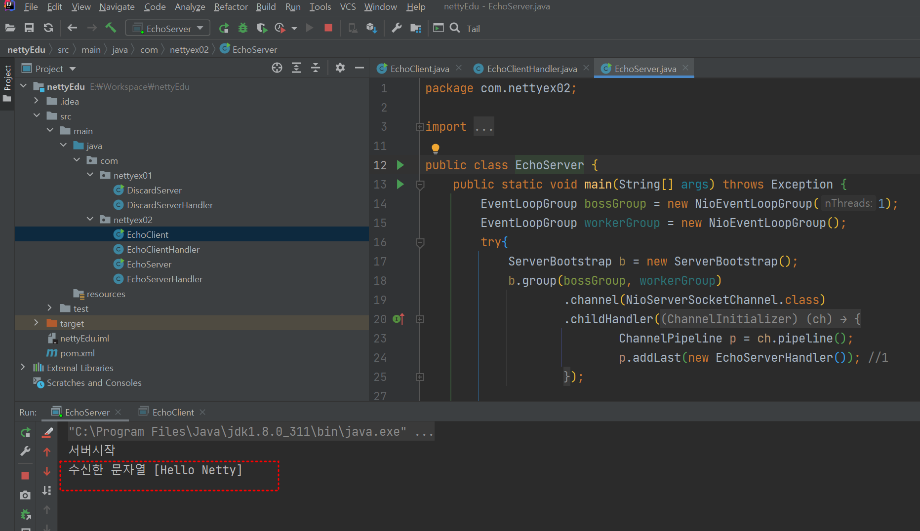 클라이언트 프로그램은 8888 서버에 접속해서 Hello Netty 문자열을 서버에 전송하고 결과를 수신한다.