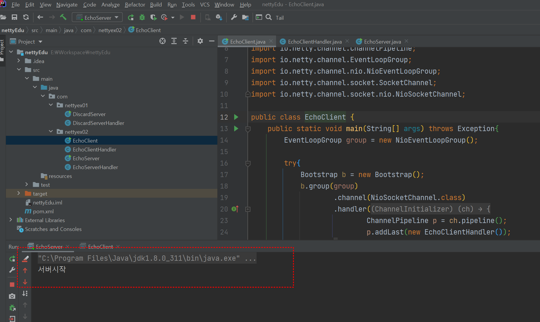main 메서드가 있는 EchoClinet.java 와 서버에 데이터를 보내고 응답을 받는 EchoClinetHandler.java