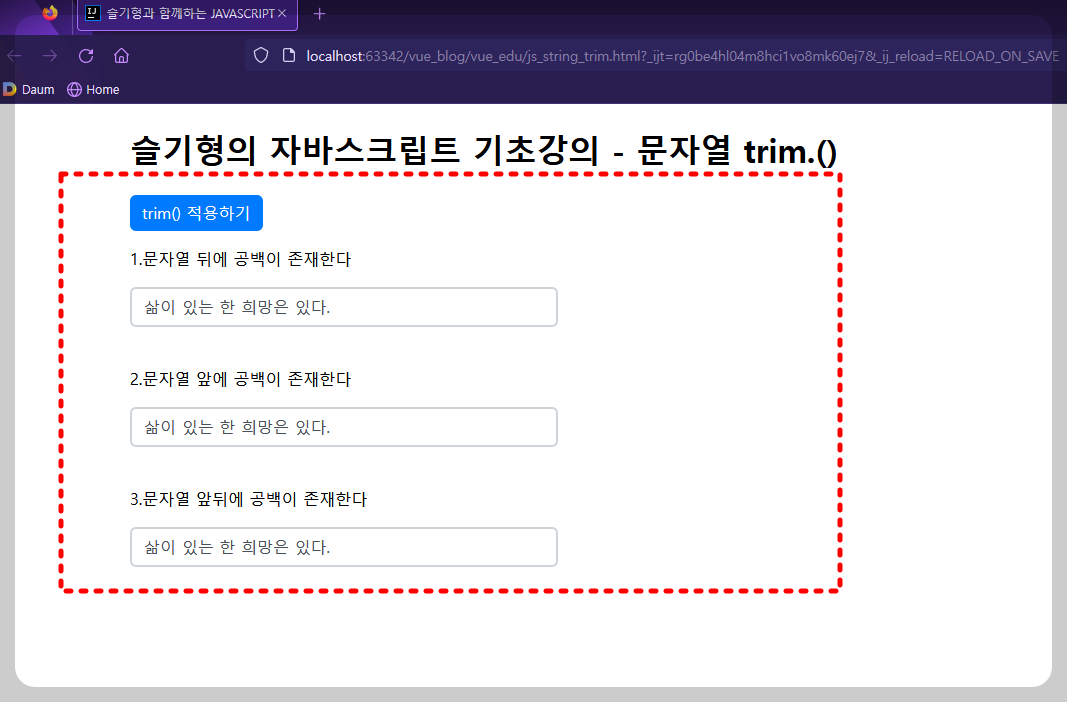 <h1>슬기형의 자바스크립트 기초강의 - 문자열 trim.()</h1>